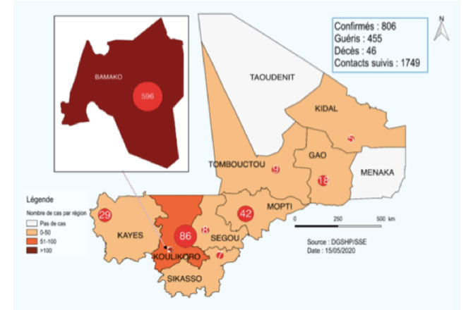 Il rapporto n.52 del 15 maggio 2020 sulla situazione Covid-19 in Mali redatto dal Ministero della Sanità e degli Affari Sociali ha dichiarato che i casi positivi ammontano a 806, i decessi a 46 e i pazienti guariti a 455 di cui 8 trasferiti fuori dal paese. Nove regioni e 24 distretti sanitari sono toccati dall’epidemia. L’età media dei contaminati è di 46,55 anni con un 64% di casi di un’età compresa tra i 15 e i 54 anni.